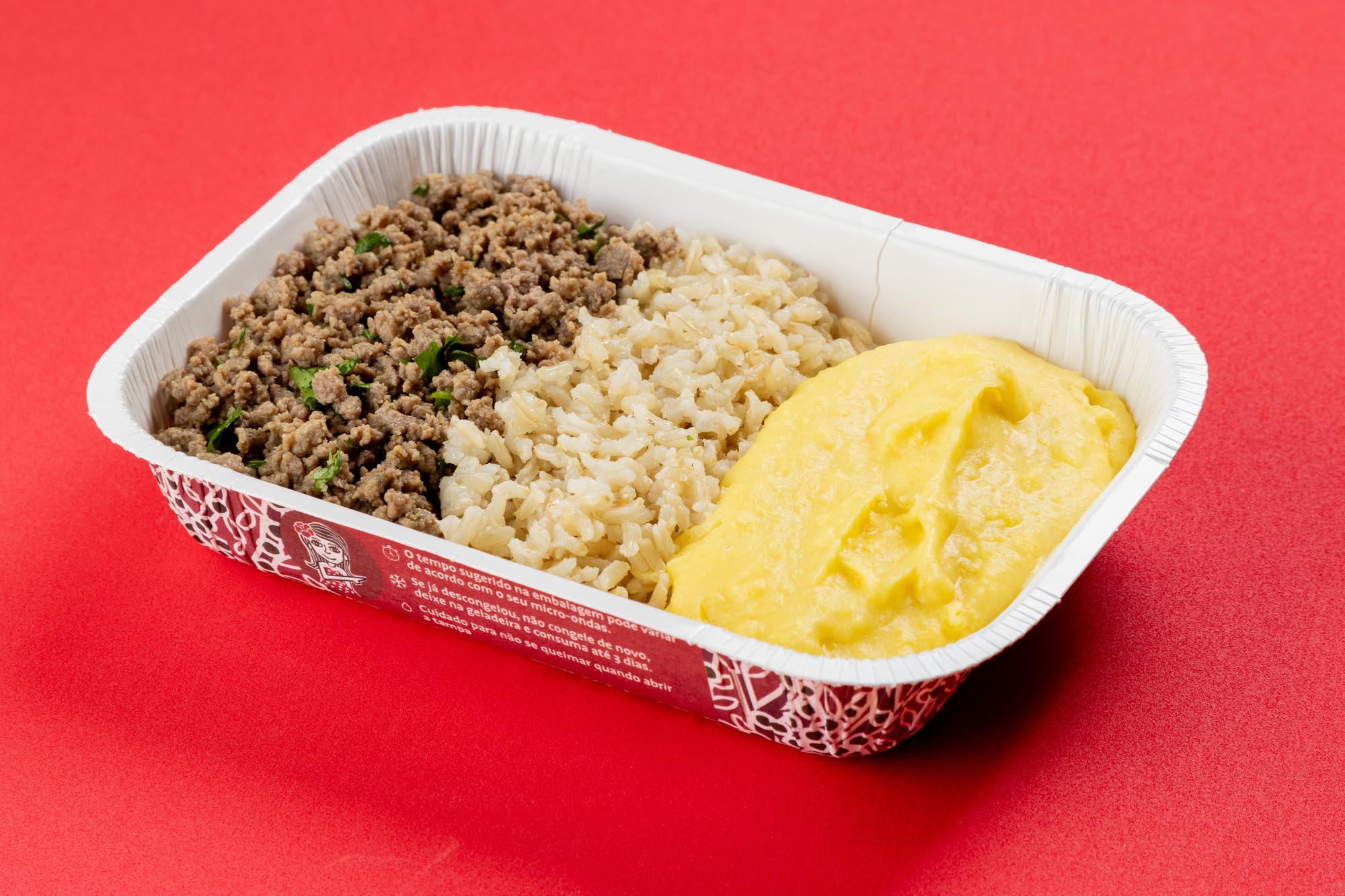 Deliciosa carne moída de patinho, refogada com cebolinha e temperos naturais, arroz integral e purê de mandioquinha. Produto ultracongelado que mantém o sabor dos ingredientes e traz praticidade para o seu dia.