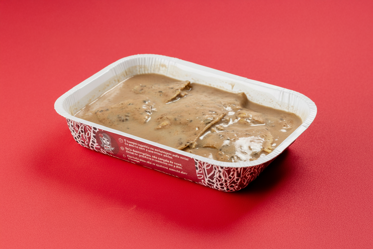 Deliciosa marmita de Crepe integral recheado com frango desfiado e molho de cogumelos Funghi. Produto ultracongelado que mantém o sabor dos ingredientes e traz praticidade para o seu dia.