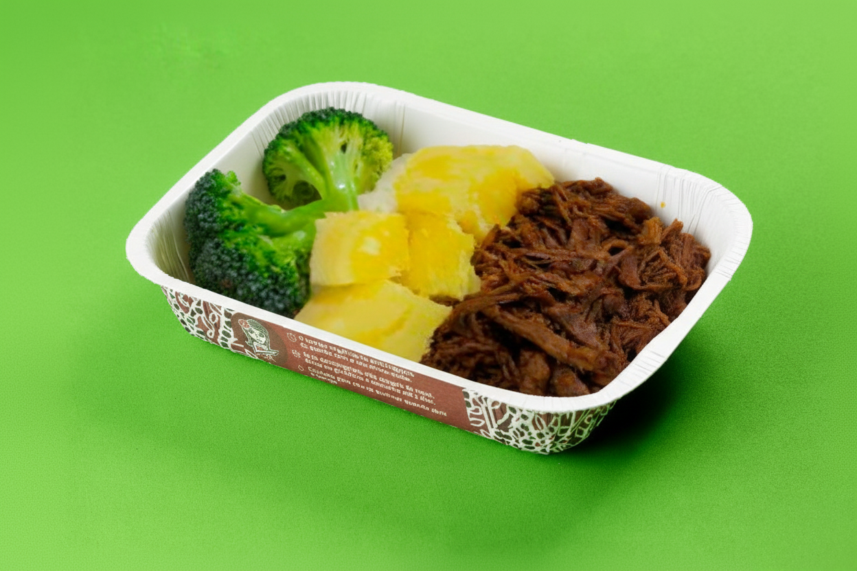 Deliciosa marmita de patinho desfiado ao molho com mandioca cozida derretendo e brócolis cozido no vapor. Produto ultracongelado que mantém o sabor dos ingredientes e traz praticidade para o seu dia.